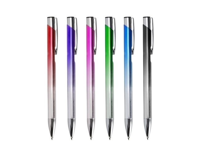 Caneta metálica bicolor com carga esferográfica azul 1.00mm e acionamento por clique.