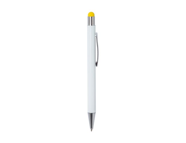 Caneta metálica com touch screen, carga esferográfica azul e acionamento por clique.