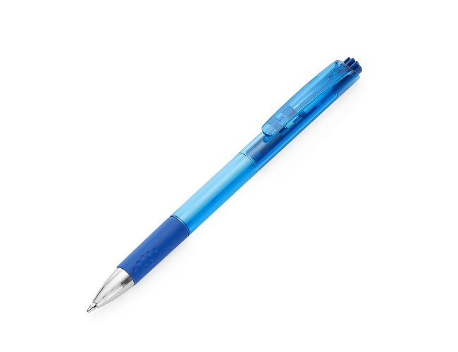 Caneta plástica translúcida colorida com detalhe inferior emborrachado. Aciona por clique e é destravado pressionando a parte inferior do clip.