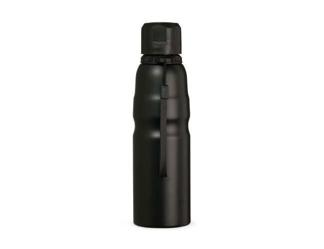 Garrafa inox 800ml com tampa plástica rosqueável e cordão para transporte.