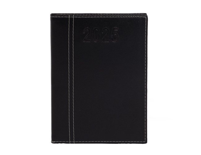 Agenda produzida em couro sintético, possui detalhes de costura e escrita do ano ?2025? na parte superior direita. Conté