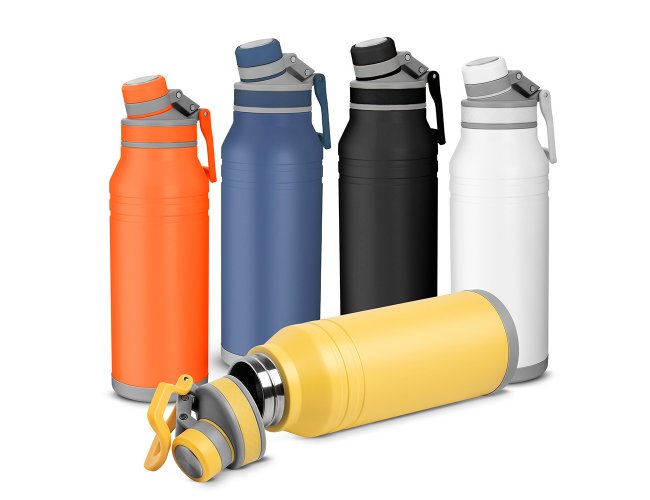 Garrafa térmica de inox livre de BPA com capacidade de 1 litro. Contém alça para transporte.