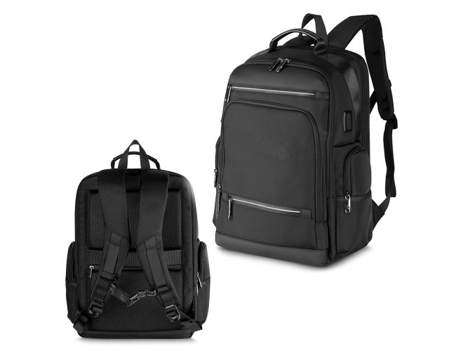 Mochila premium, produzida com poliéster acolchoado, alças de ombro acolchoadas, bolso frontal com zíper,divisória interna para canetas e pequenos objetos, aceita notebook de até 15,6 , porta USB na lateral, com engate para mala de viagem. * Acompanha placa em aço inox.
